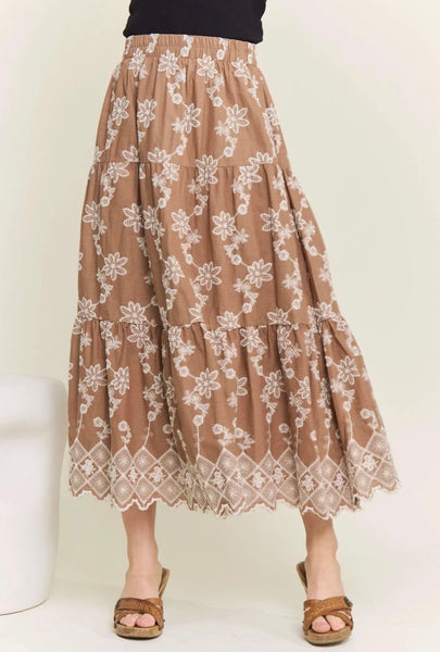A beautiful floral embroidery skirt with a stretchy waist for a comfy, flattering fit. Finished with an intricate charm, and detailed eyelet trim. True to size, realxed fit.